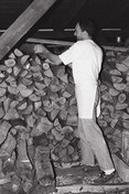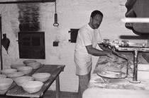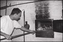 Bereits 24 Stunden vor Arbeitsbeginn wird der Ofen angezündet und mit sechs Scheiten Brennholz beschickt (Stärke 15cm). Nach einer Stunde intensiven Brennens drosseln wir die Luftzufuhr bzw. Abluft auf ein Minimum, da der eigentliche Brennvorgang abgeschlossen ist. In dieser Phase nimmt der Korpus (das Massiv) die meiste Hitze auf und speichert sie. Diesen Vorgang wiederholen wir nach sechs Stunden noch zweimal, sodass es zu drei Heizperioden kommt. Nach schließen der Ofenklappe hat der Ofen 600 Grad und fällt in den nächsten zehn bis zwölf Stunden bei geschlossenem Zug auf ca. 280 Grad. Jetzt wir der Ofen mit einem Drahtbesen ausgekehrt und mit einem Jutesack ausgeschleudert (Bäckerfahne). Hierbei fällt der Ofen auf ca. 250 Grad, welches der optimalen Backtemperatur entspricht.