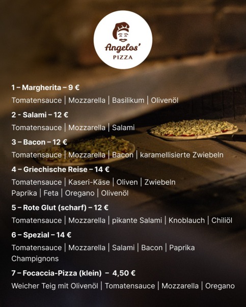 Ab dem 06.09.2025 biete ich in Zusammenarbeit mit Angelos Ziavros zunächst jeden Sonntag (12.00-20.00 Uhr) traditionelle Pizzavarianten mit Fleisch aus heimischen Betrieben (Hof Stork in Küntrop) aus meinem Holzofen, unter dem Logo ,,Angelos Pizza“ an.